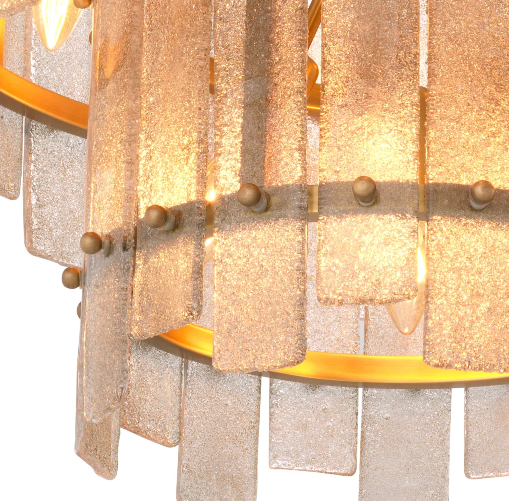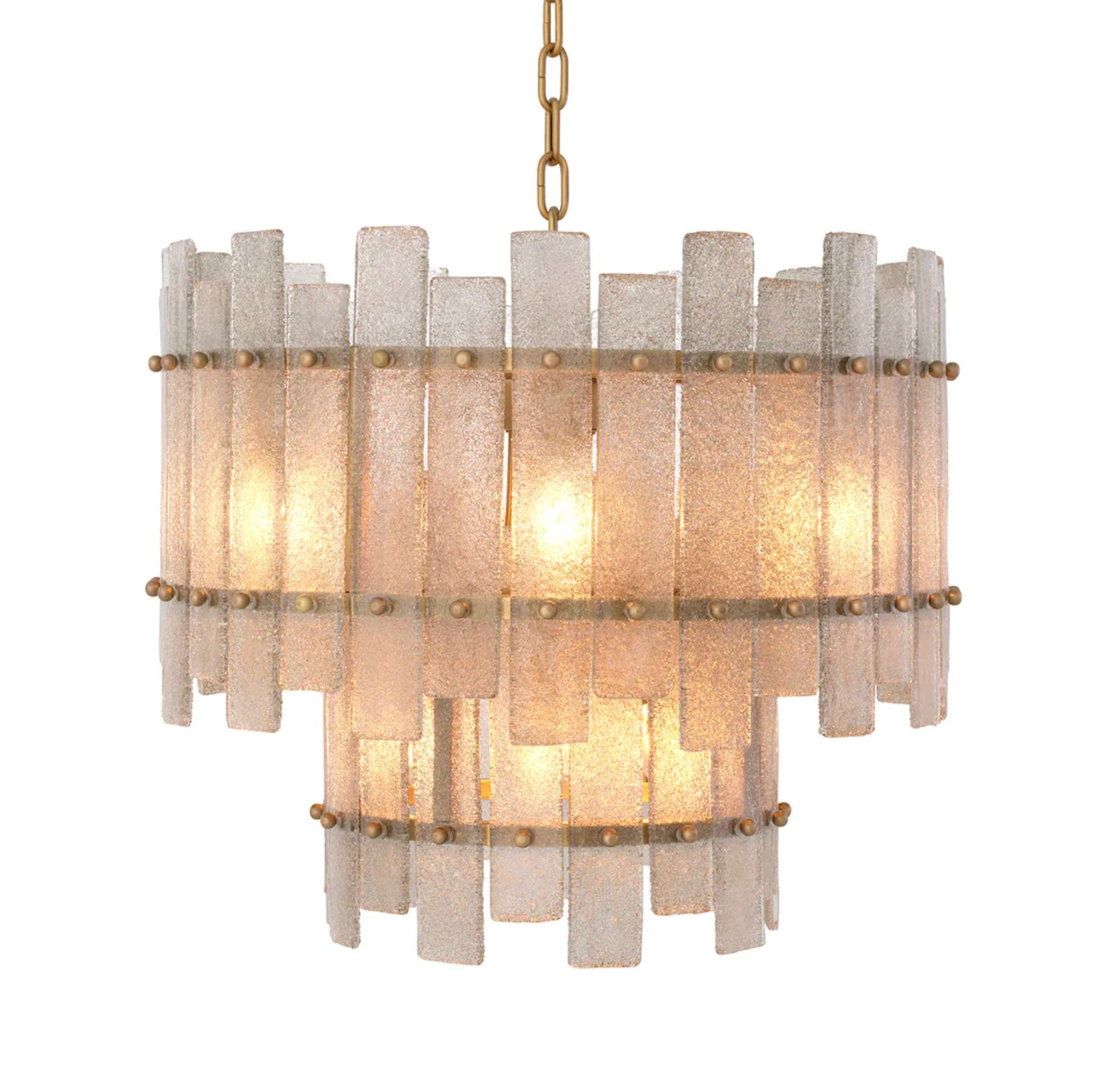 Finished in antique brass, it features 10 lights in a tapered, two-tiered design. The drops are made of hand-blown glass with a roughened backside, which produces a startling effect when the lamp is lit.Dimensions