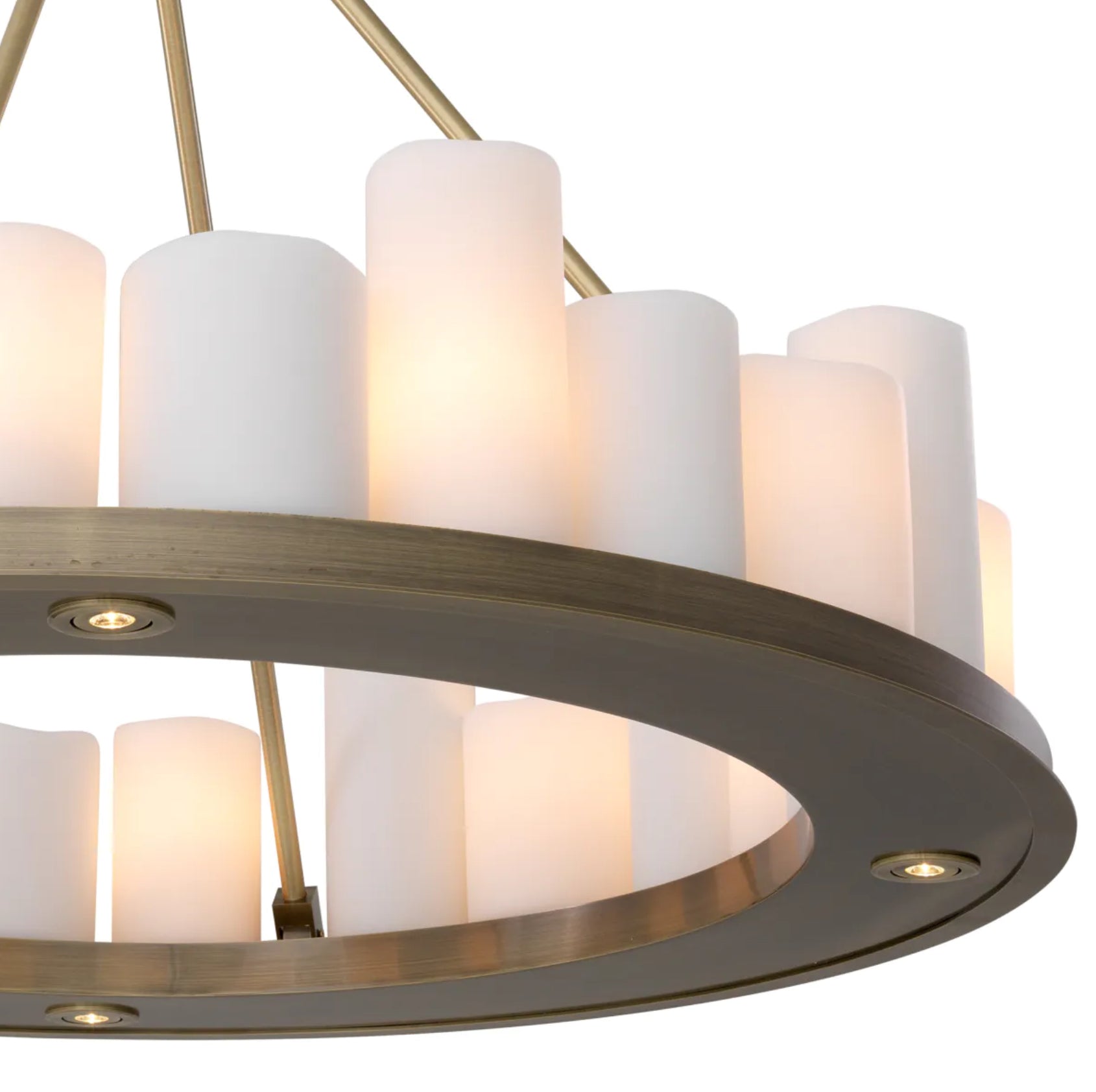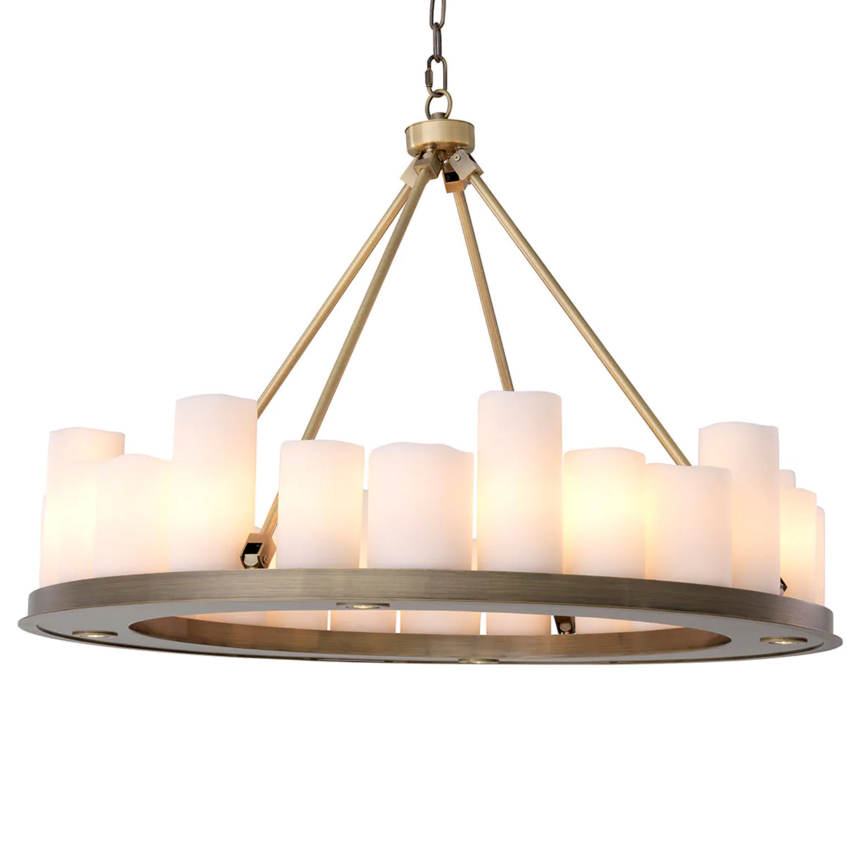 The round light brushed brass finish frame of the Commodore Chandelier is supported by a strong chain link ceiling canopy.