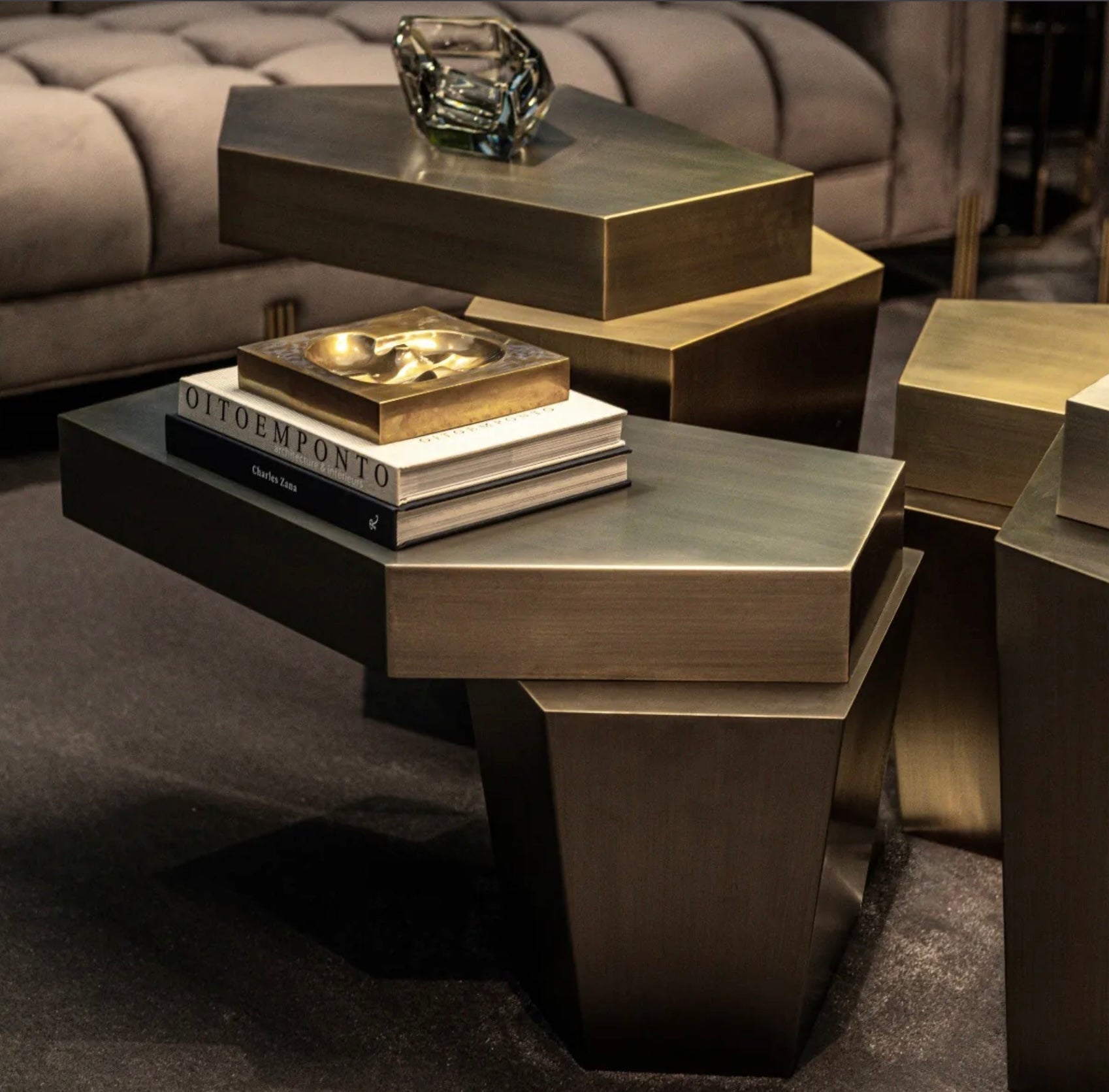 The peculiar shape of this modern coffee table with brushed brass finish reminds one of stacked stones. Its solid construction adds to its sturdy appearance and makes this table very durable. Pair together with a higher Calabasas Coffee Table for extra tabletop space and a bold look.Dimensions